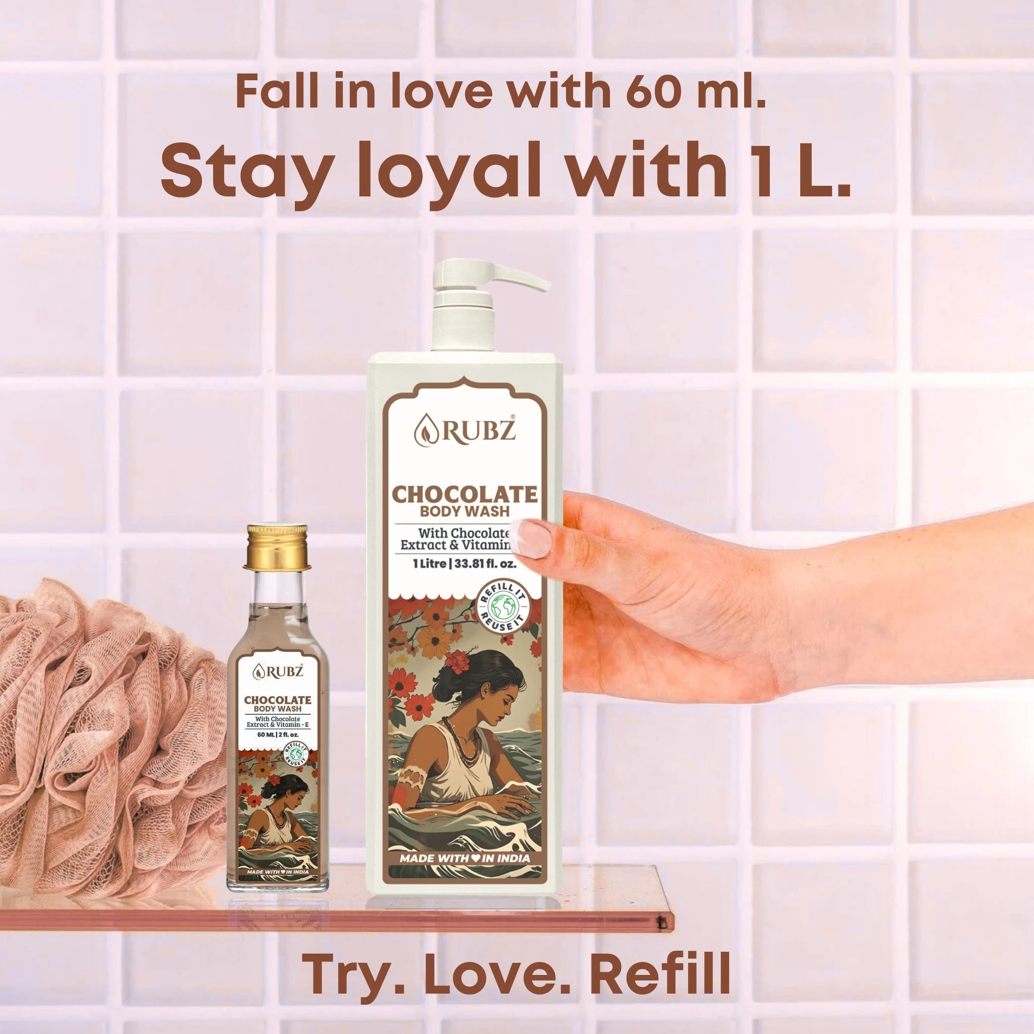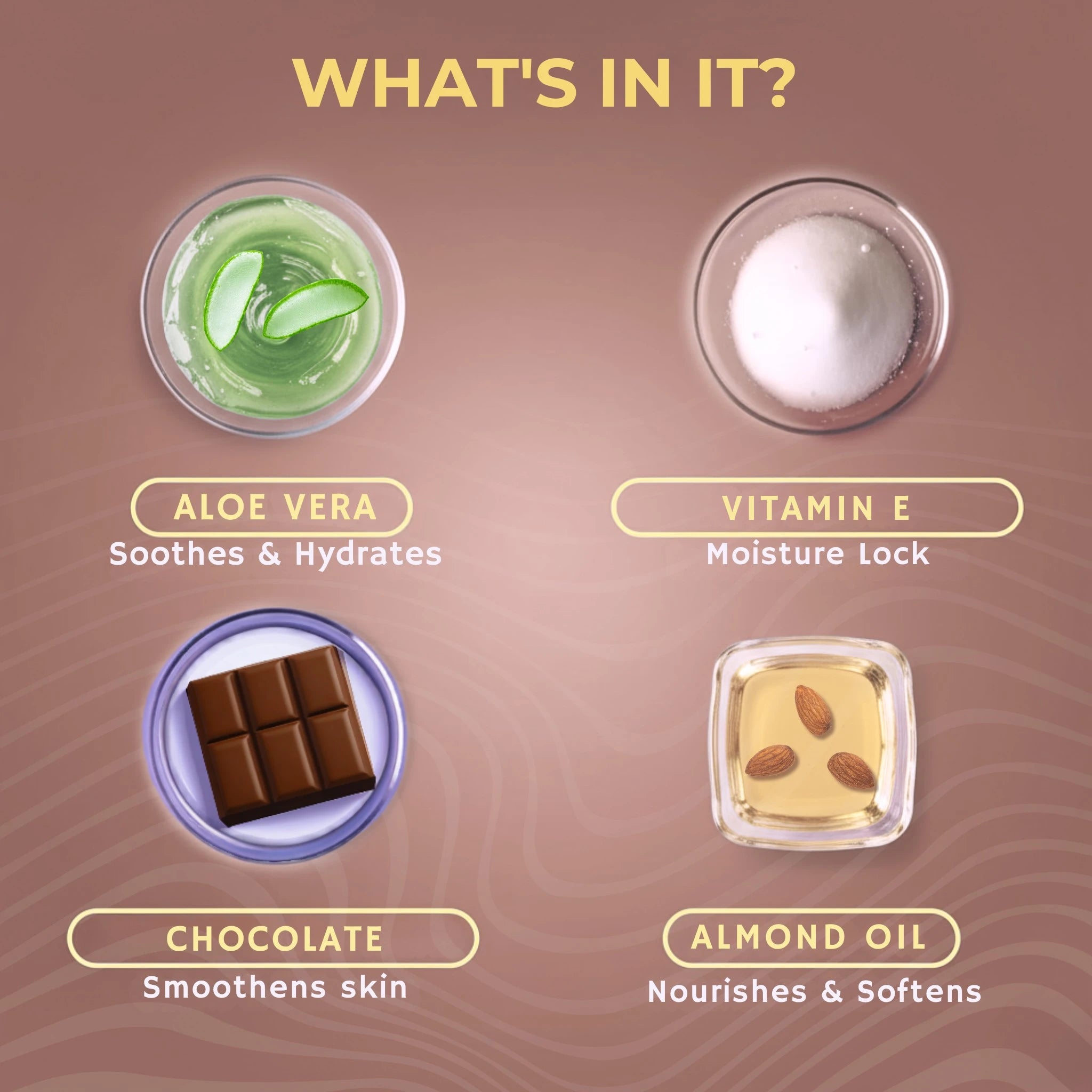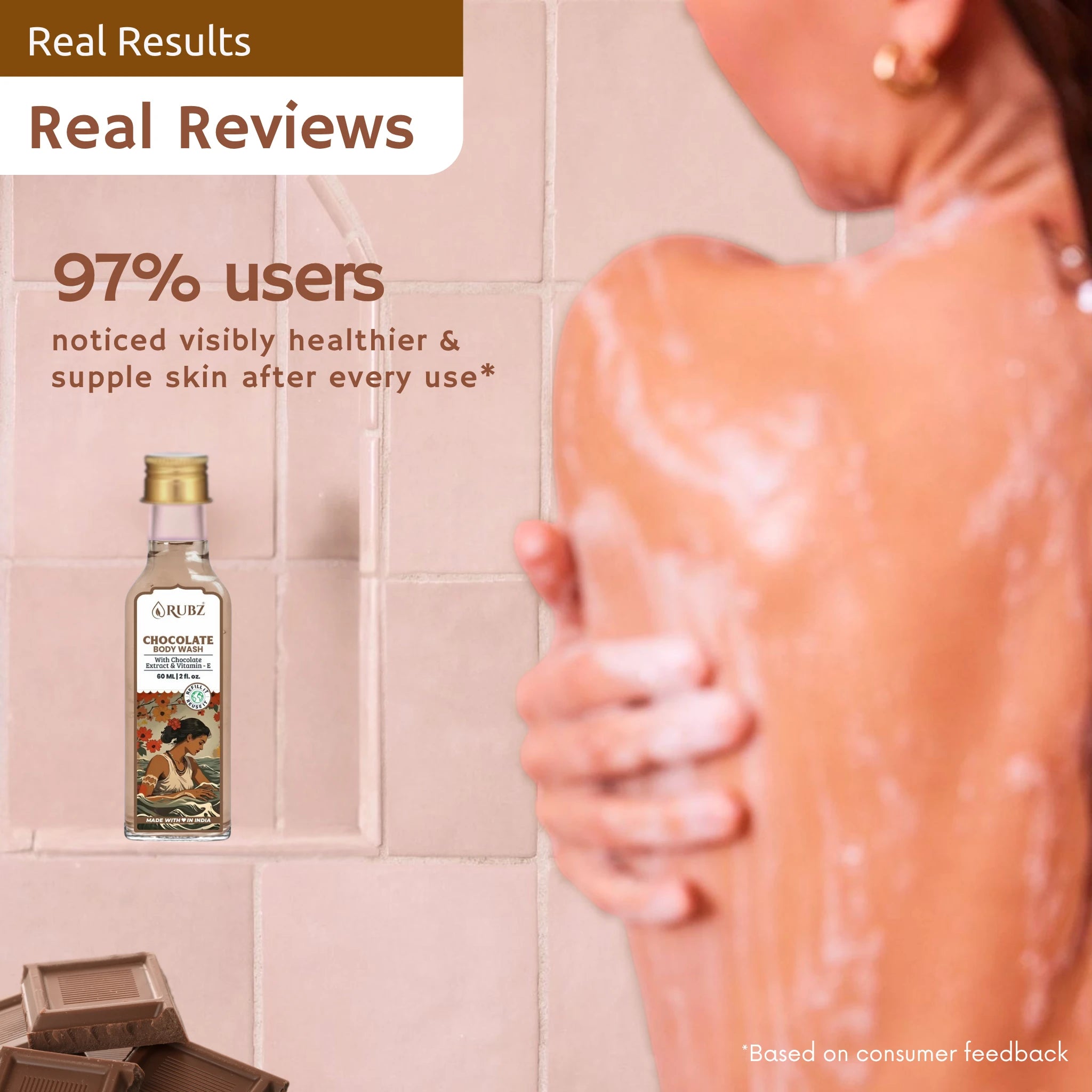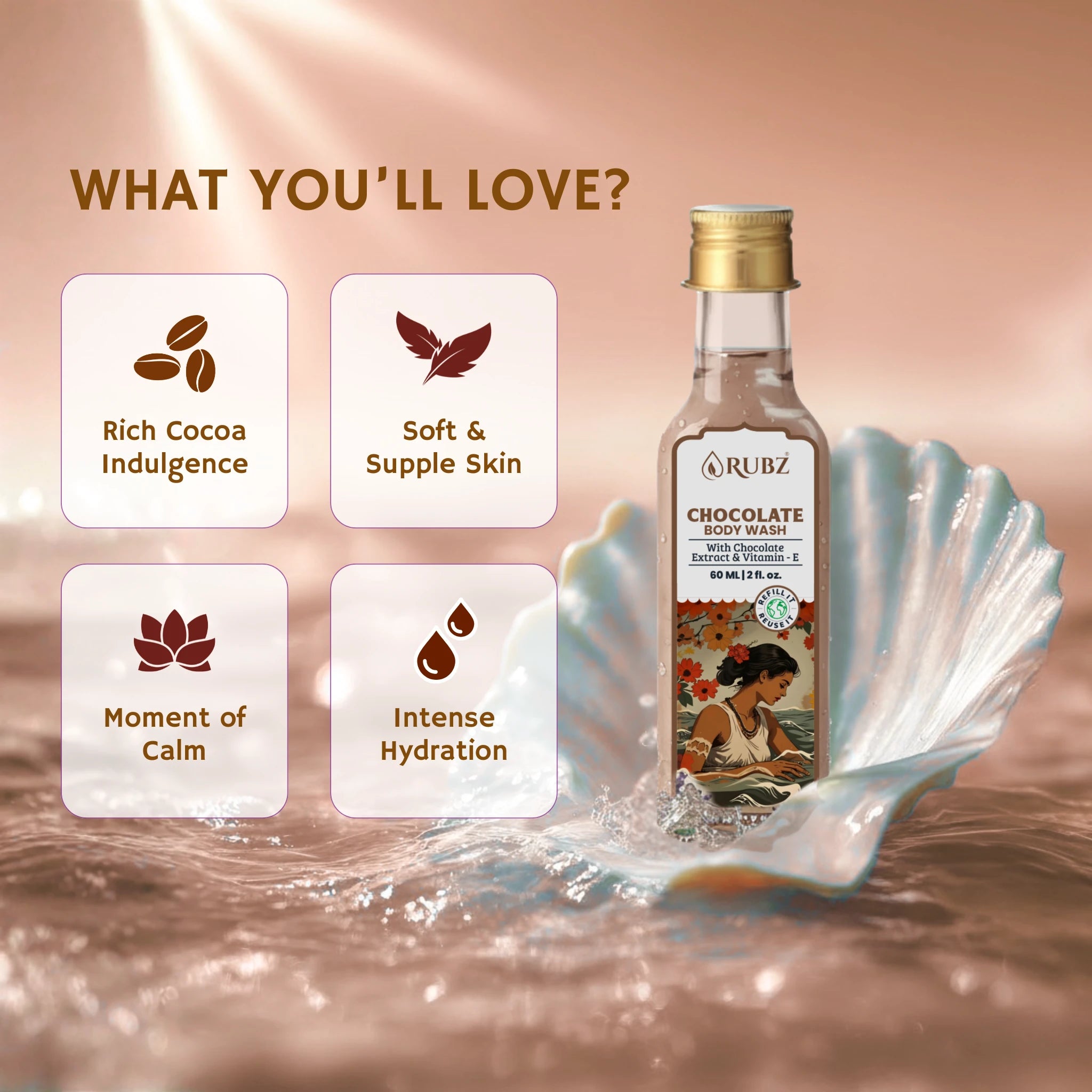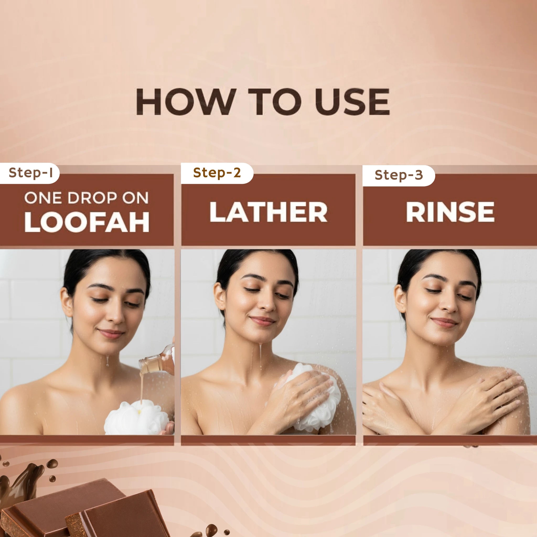 This natural chocolate body wash nourishes dry skin, leaving it soft, smooth, and deeply hydrated.