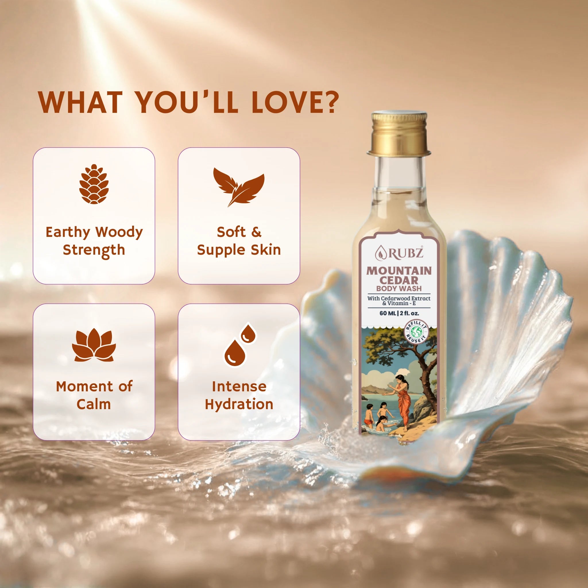 Our mountain cedar body wash blends a fresh, woody aroma with the essence of nature for a revitalizing shower experience.