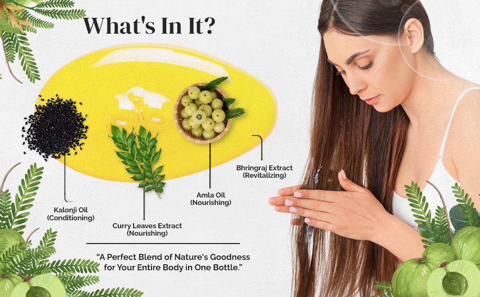 - Enhanced Scalp Health with Extracts: Infused with Curry Leaves Extract and Bhringraj Extract, this hair oil revitalizes the scalp, improving blood circulation and creating a healthier environment for hair growth, while addressing issues like dandruff.