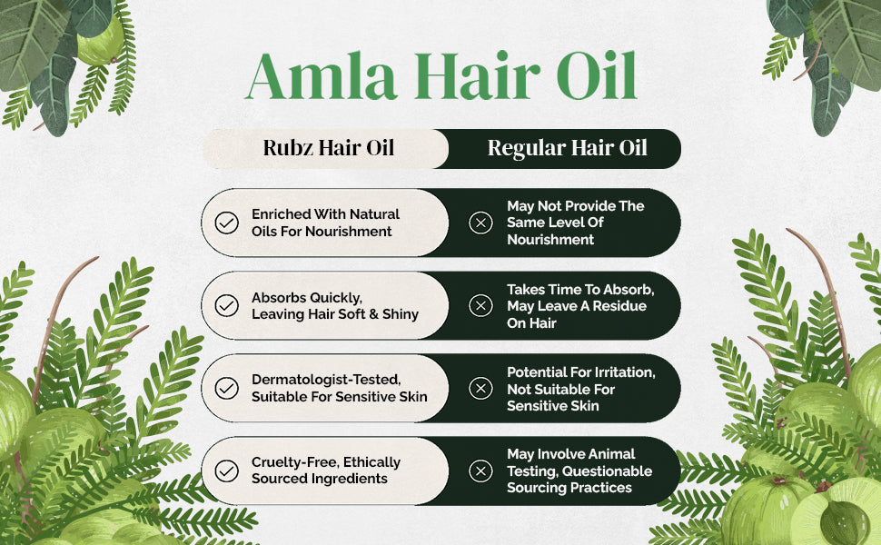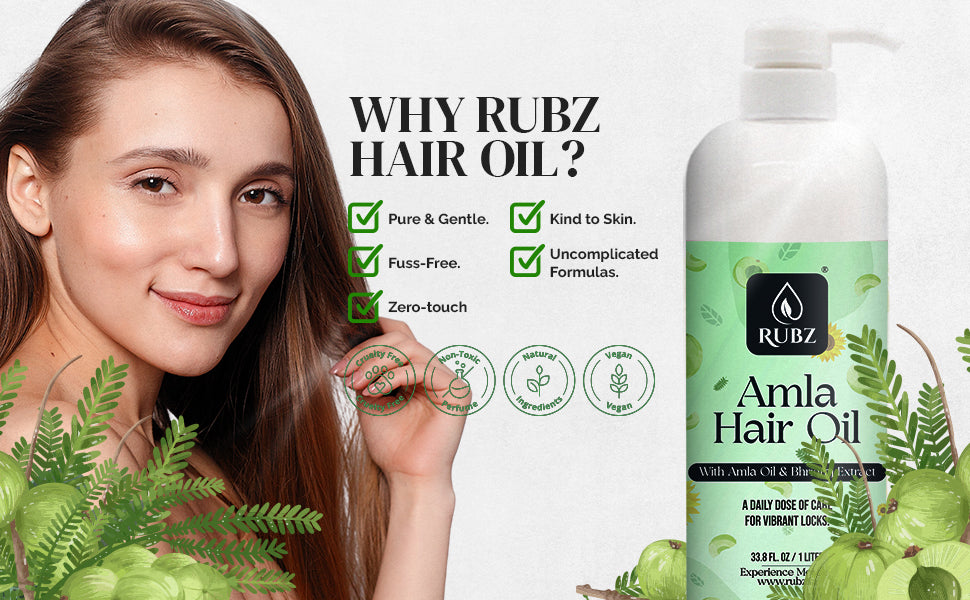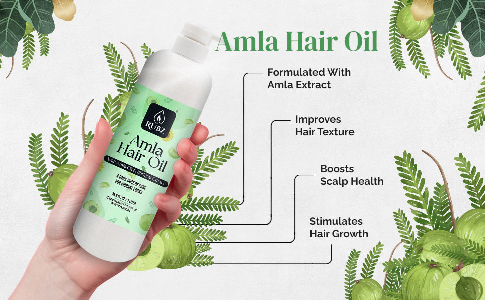 - Amla-Infused Hair Vitality: Rubz Amla Hair Oil harnesses the power of Amla Oil, known for its hair-strengthening properties, to stimulate growth and enhance overall hair vitality.