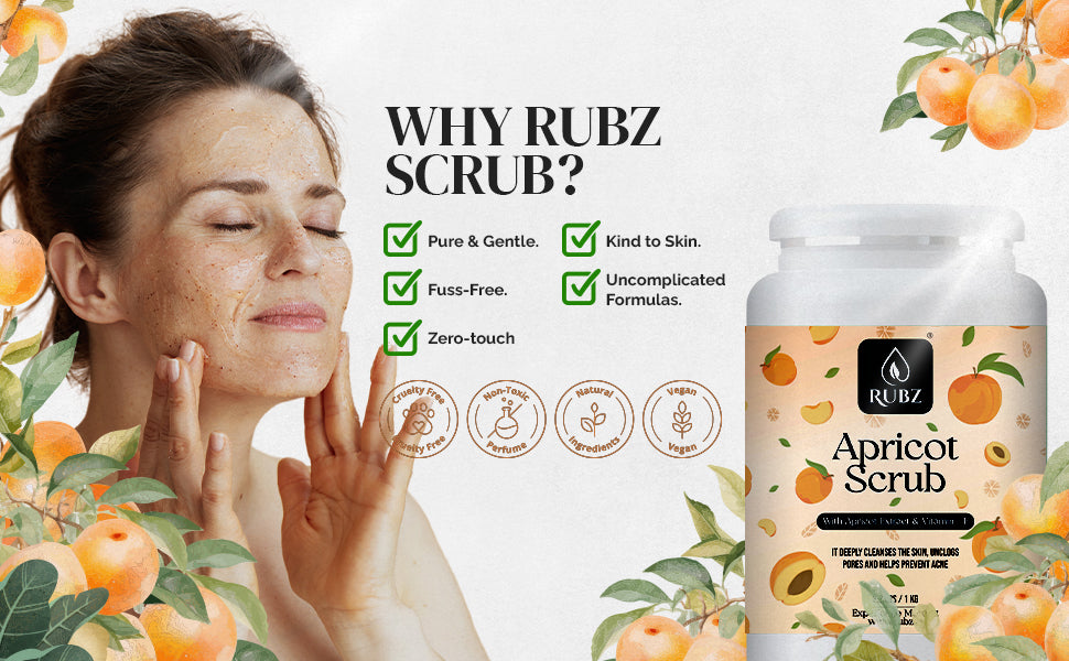 Rubz Apricot Scrub gently exfoliates, removes dead skin cells, clears blackheads, unclogs pores, and revitalizes dull skin, leaving your skin refreshed and glowing.