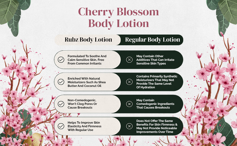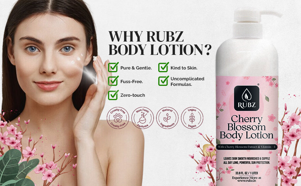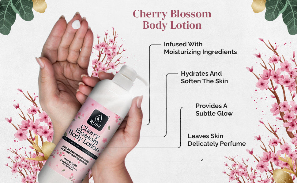 - Everyday Indulgence: Elevate your daily skincare routine with the elegance of cherry blossoms. Suitable for all skin types, Rubz Cherry Blossom Body Lotion is the perfect way to infuse your self-care ritual with a touch of nature's beauty.