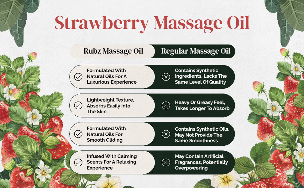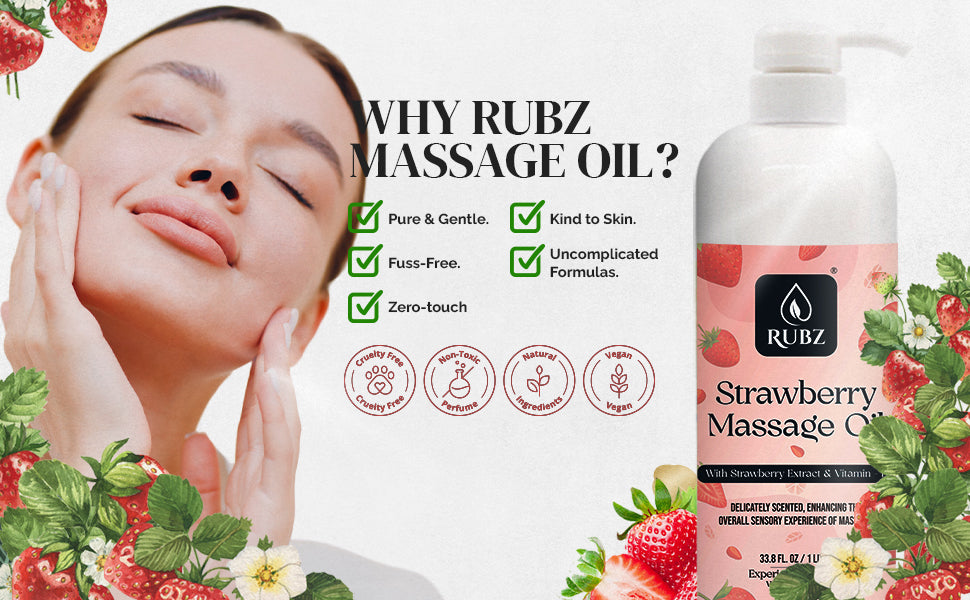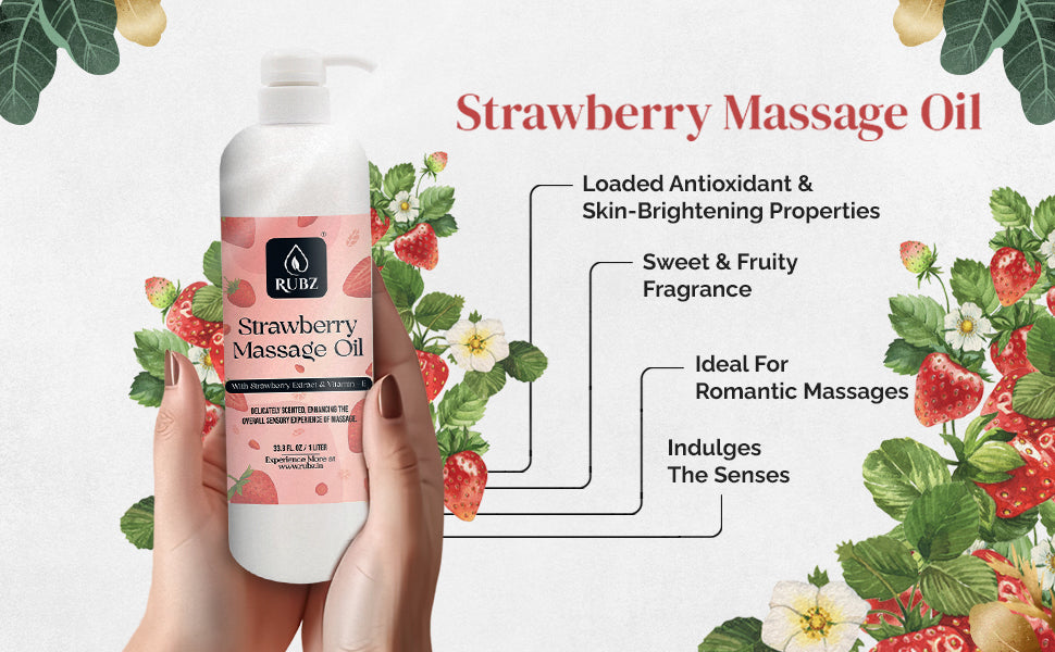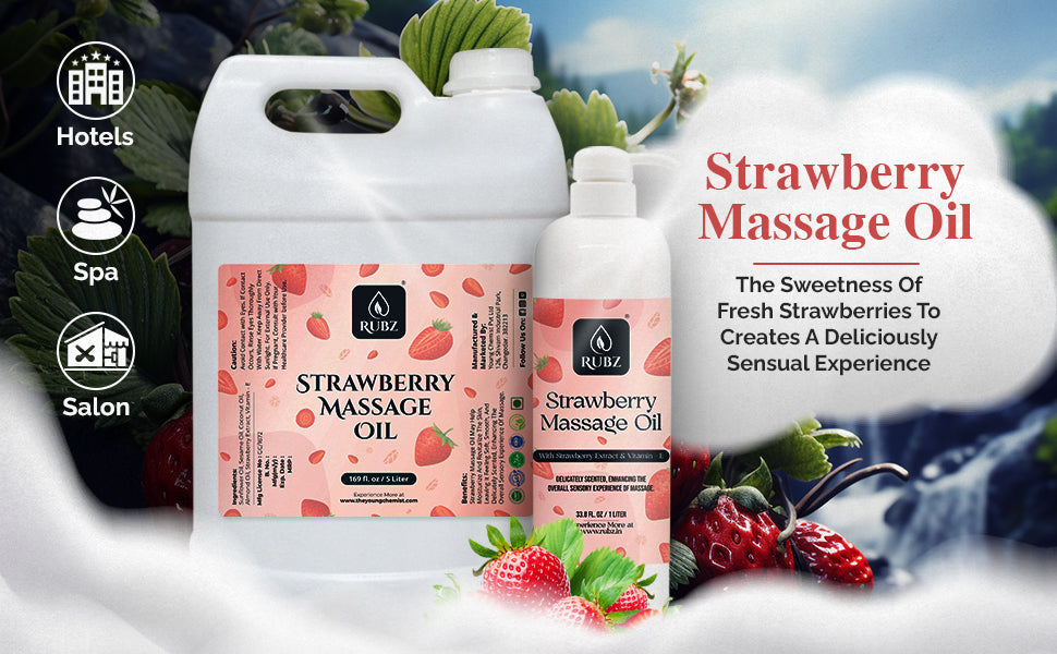 - Sweet Strawberry Delight: Immerse yourself in the sweet and delightful scent of strawberries with Rubz Body Massage Oil. Its luscious and fruity fragrance creates a joyful and uplifting ambiance during your massage.