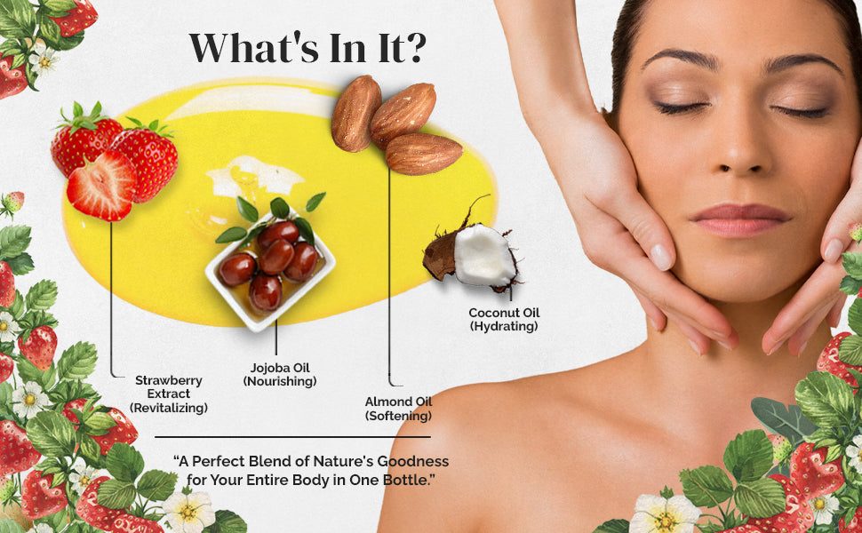 - Skin Nourishment: Enriched with natural botanical extracts, our Strawberry Body Massage Oil deeply hydrates and revitalizes your skin, leaving it soft, supple, and beautifully moisturized. Enjoy the dual benefit of relaxation and skin pampering.
