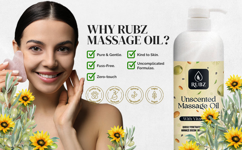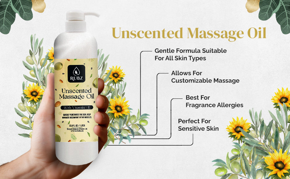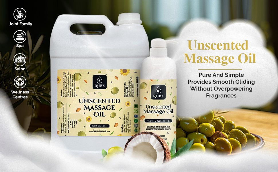 - Pure Tranquillity: Experience pure tranquillity with Rubz Unscented White Body Massage Oil, specially designed for spa treatments. Its unscented nature allows you to focus solely on relaxation, free from overpowering fragrances.