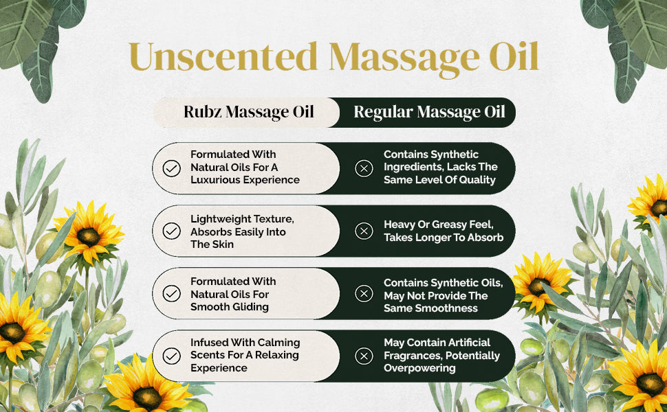 - Professional-Grade Quality: Rubz Unscented White Body Massage Oil is trusted by spa professionals for its high-quality formula. Whether you're a spa enthusiast or a spa owner, you can count on the excellence of our massage oil for superior spa treatments.