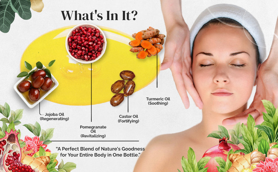 - Youthful Radiance Infusion: Immerse your skin in a rejuvenating blend of Pomegranate Oil and Turmeric Oil, known for their antioxidant-rich properties. This dynamic duo works synergistically to promote a youthful glow, revitalizing your skin with each massage.