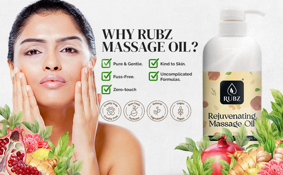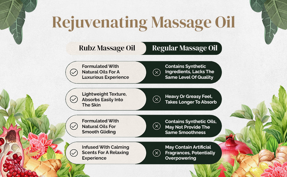 - Holistic Rejuvenation for Mind and Body: Imbibe your self-care routine with the holistic benefits of Rubz Rejuvenating Massage Oil. Allow the aromatic fusion of natural oils to transport you to a realm of relaxation, where your senses are invigorated, and your body is revitalized. Embrace the ultimate rejuvenation experience with every use.