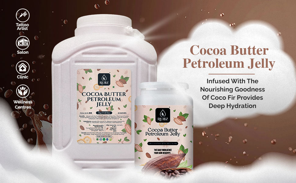- Deeply Nourishing Cocoa Butter Blend: Immerse your skin in the indulgent richness of Rubz Cocoa Butter Petroleum Jelly. This unique formula combines the deeply nourishing properties of cocoa butter, leaving your skin feeling luxuriously soft and moisturized.