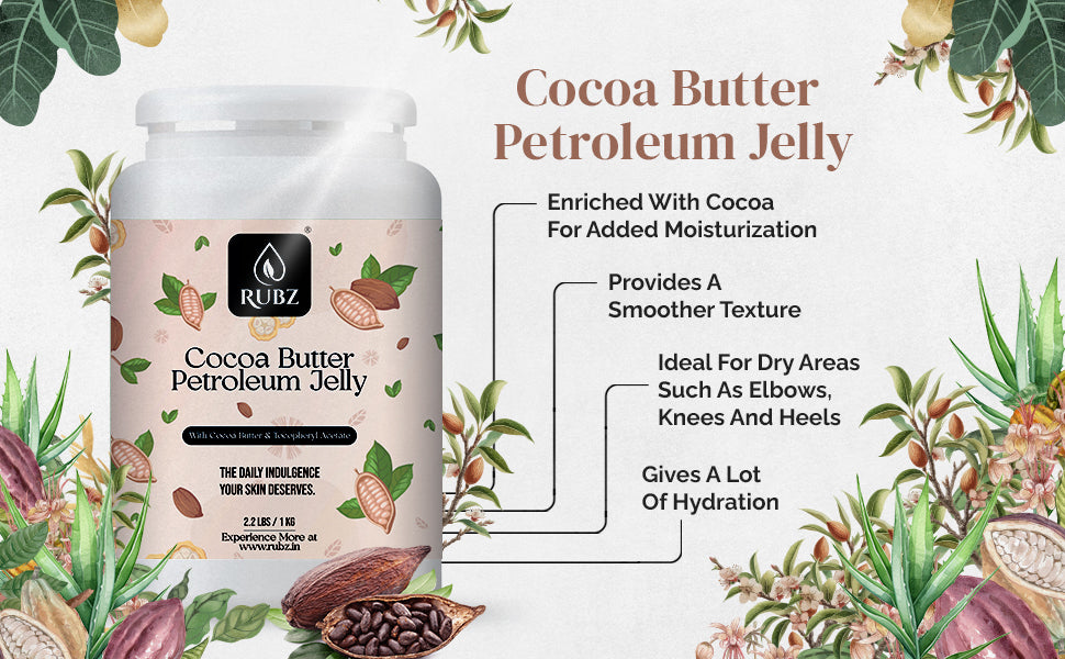 - Dermatologist-Tested for Confidence: Trust in the dermatologist-tested assurance of Rubz Cocoa Butter Petroleum Jelly. This commitment to quality ensures a safe and effective skincare experience, giving you the confidence to pamper your skin with the richness of cocoa butter.