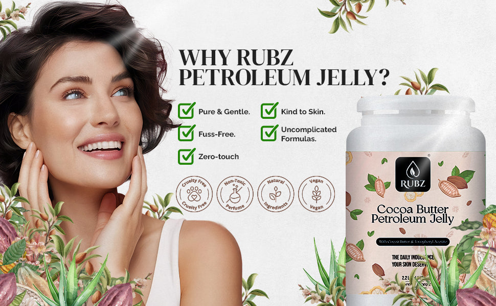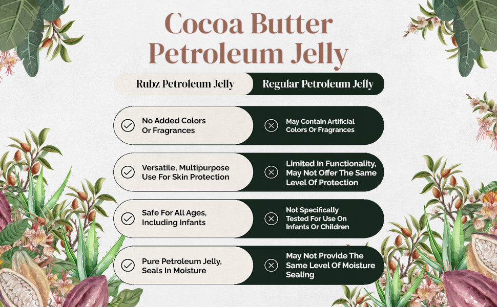 - Protective Barrier for Lasting Comfort: Create a protective shield with Rubz Cocoa Butter Petroleum Jelly, sealing in moisture and shielding your skin from environmental stressors. Enjoy all-day comfort as the barrier provides lasting hydration and a healthy, radiant glow.