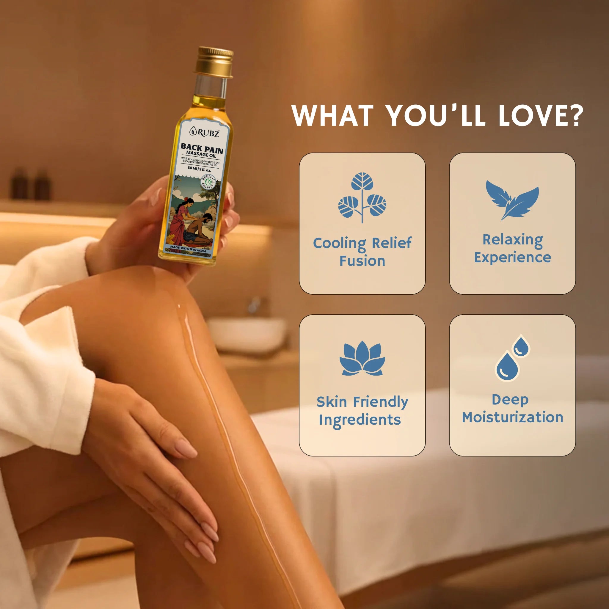A paraben free, sulphate free back pain massage oil suitable for men, women, and elderly users.