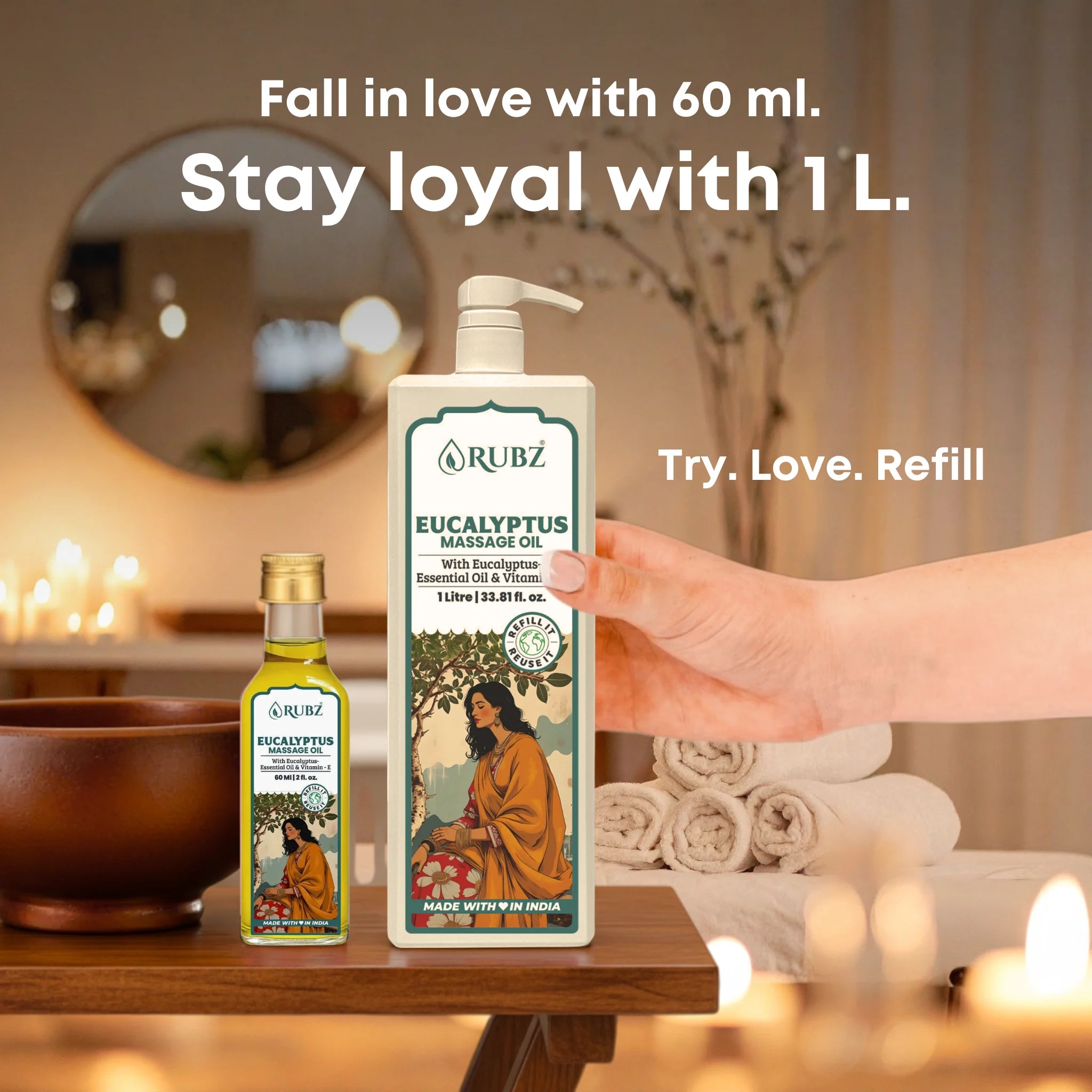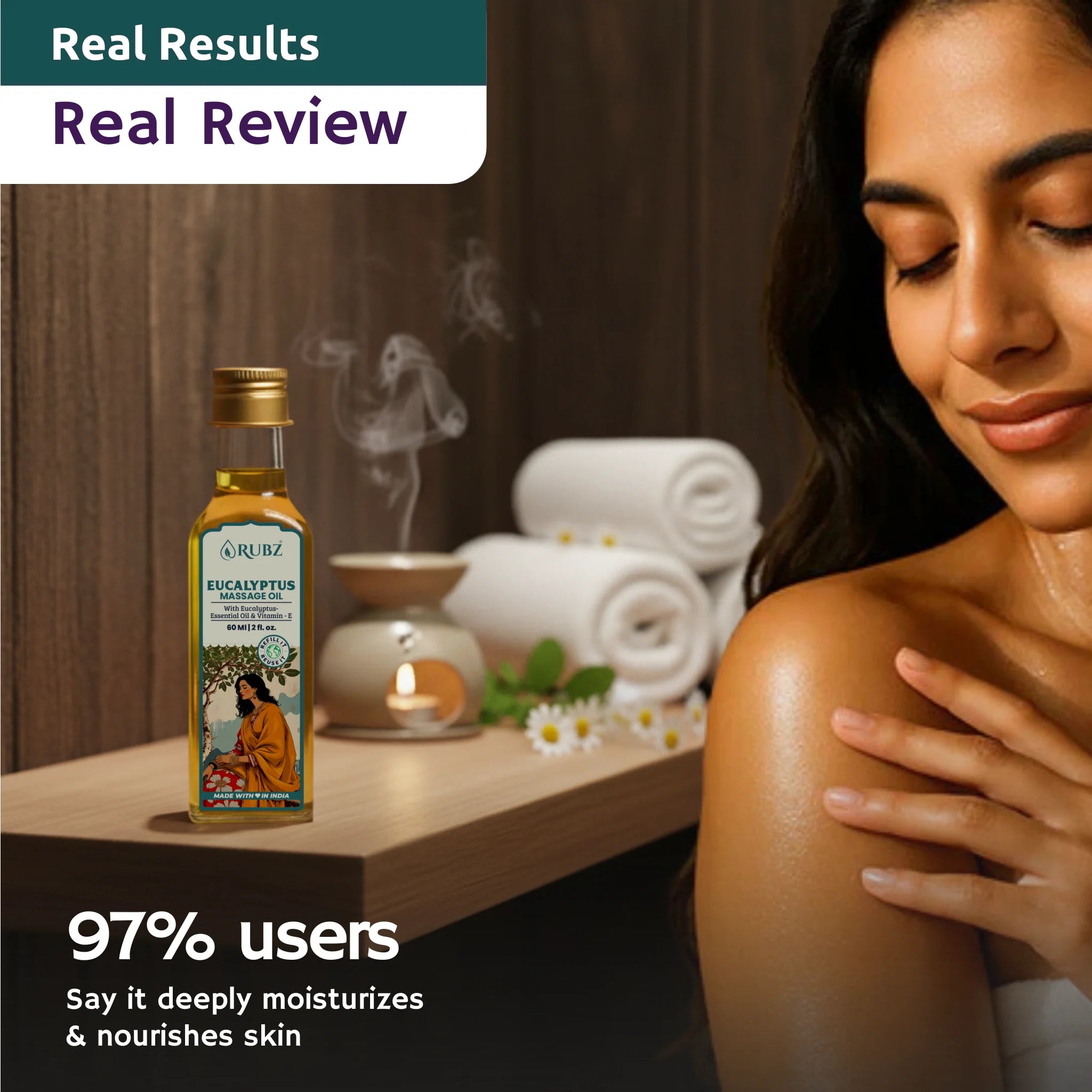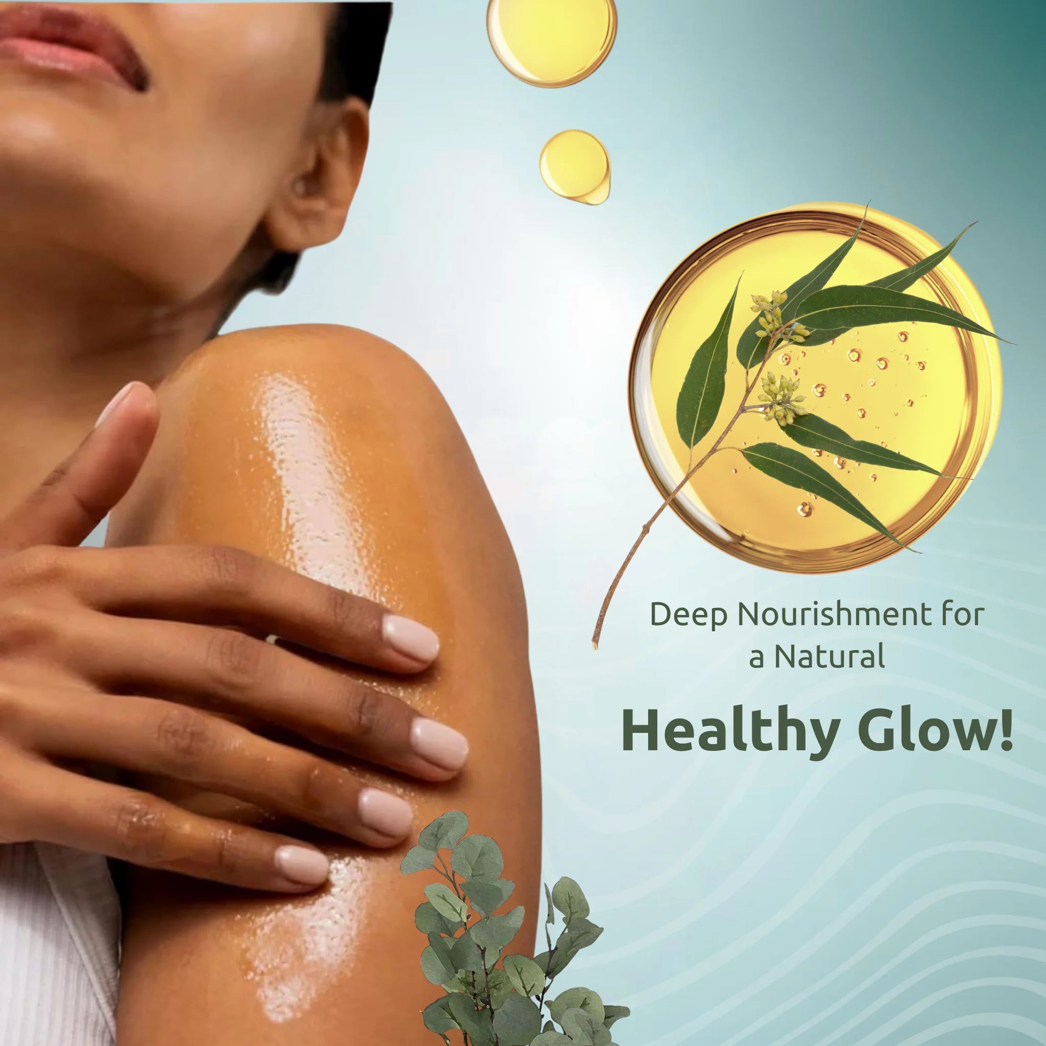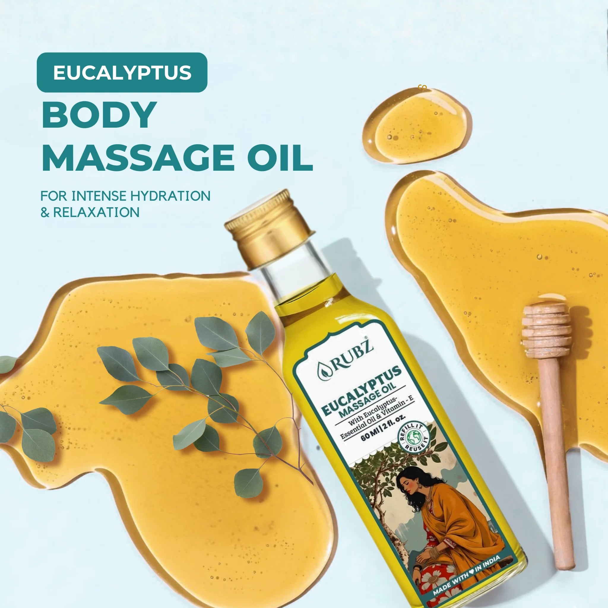 The herbal eucalyptus massage oil nourishes your skin, leaving it soft, smooth, and refreshed.