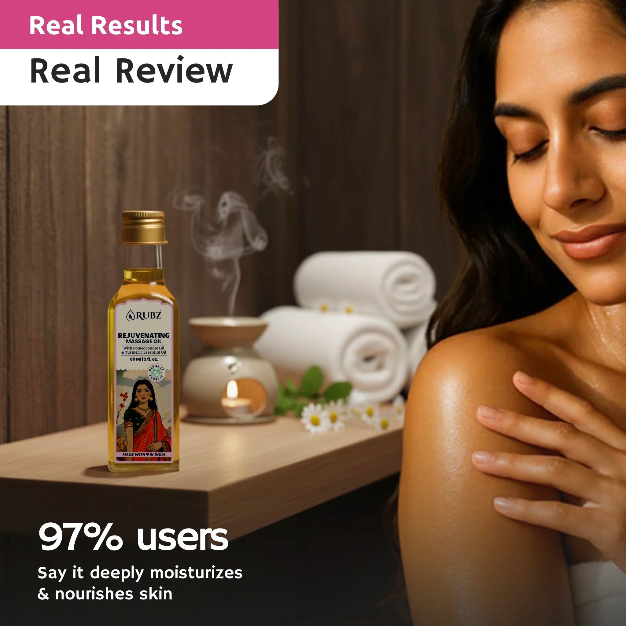A paraben free, sulphate free rejuvenating body massage oil suitable for daily self-care or spa use.