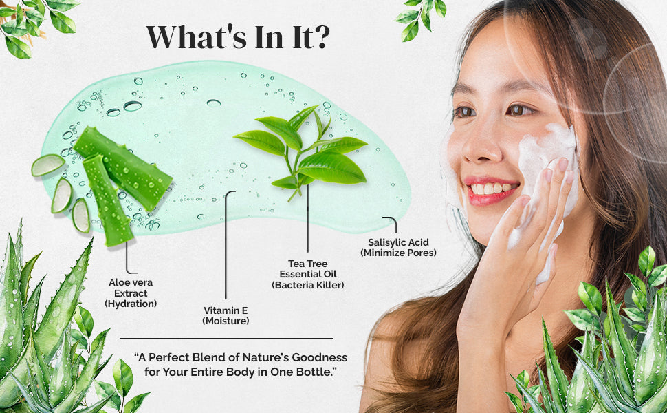 Aloe Vera Extract, Salicyclic Acid, Tea Tree Essential Oil, Vitamin E, Perfume, Facewash Base Q.S.