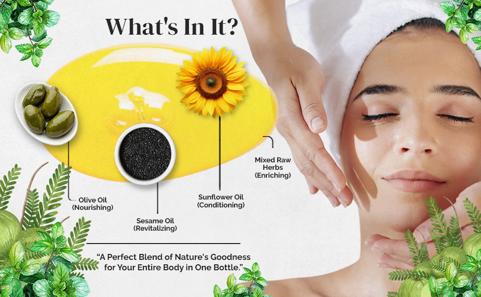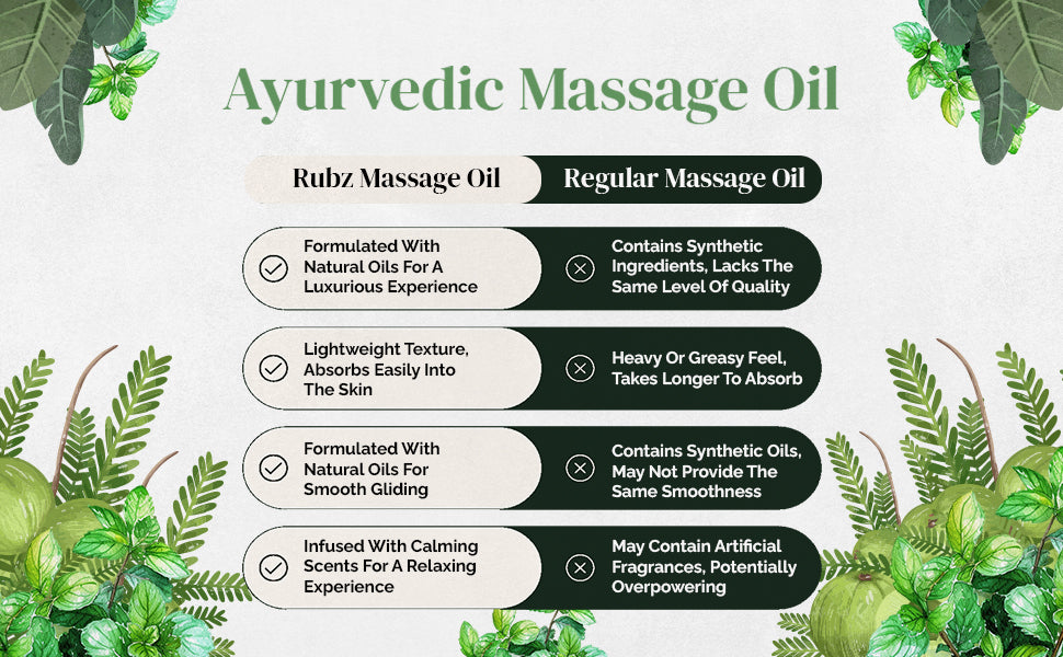 - Ancient Wisdom, Modern Wellness: Experience the harmonious blend of ancient Ayurvedic wisdom and modern wellness with our Ayurvedic Massage Oil. Derived from time-tested formulations, it offers a holistic approach to relaxation and rejuvenation.