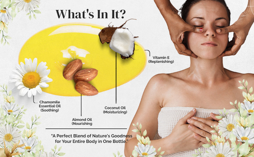 - Calming Chamomile Aroma: Immerse yourself in the calming and soothing scent of Chamomile with our Body Massage Oil. Its gentle and floral fragrance creates a serene and peaceful ambiance during your massage.