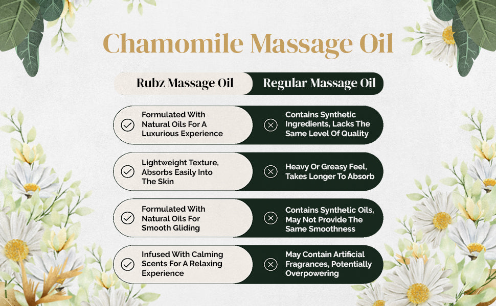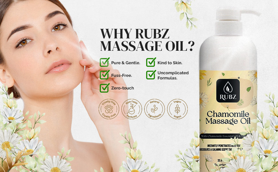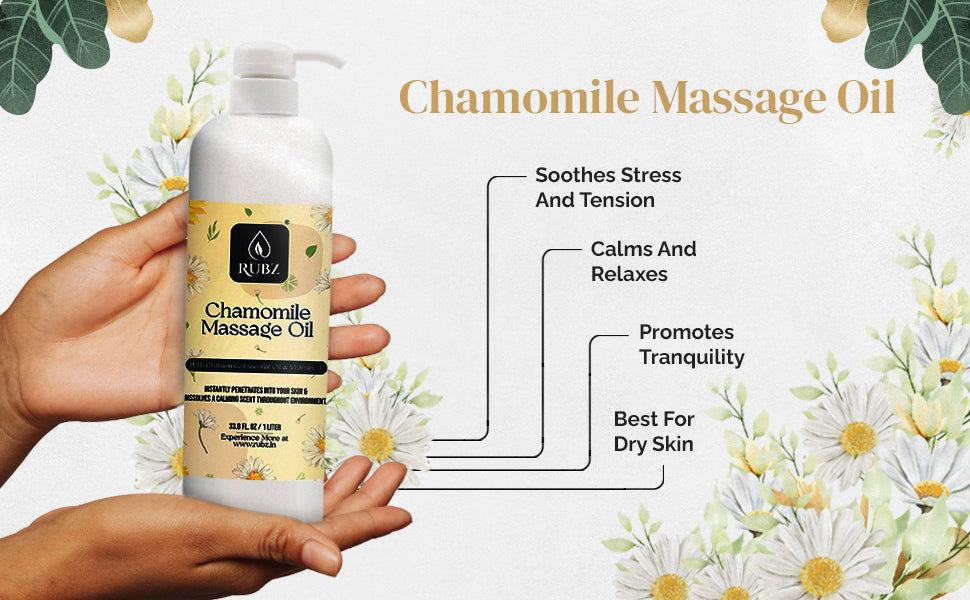 - Skin Rejuvenation: Enriched with natural botanical extracts, Rubz Chamomile Body Massage Oil nourishes and hydrates your skin, leaving it soft, supple, and beautifully rejuvenated. Enjoy the dual benefit of relaxation and skin pampering.