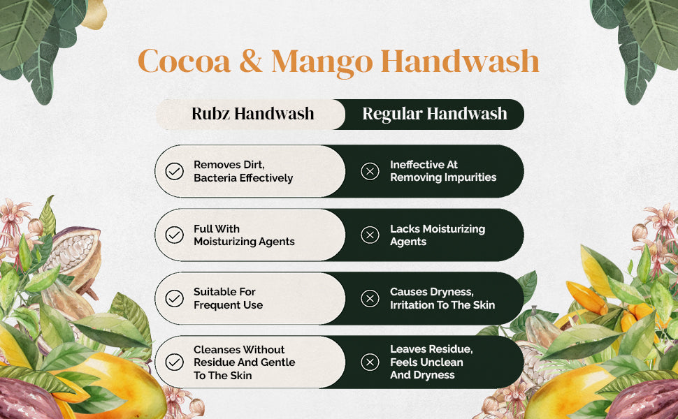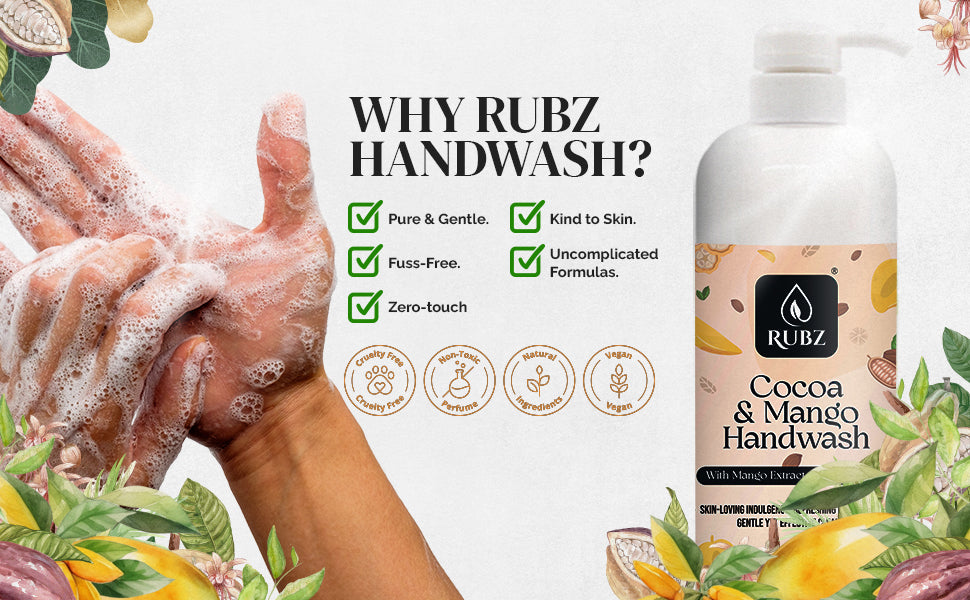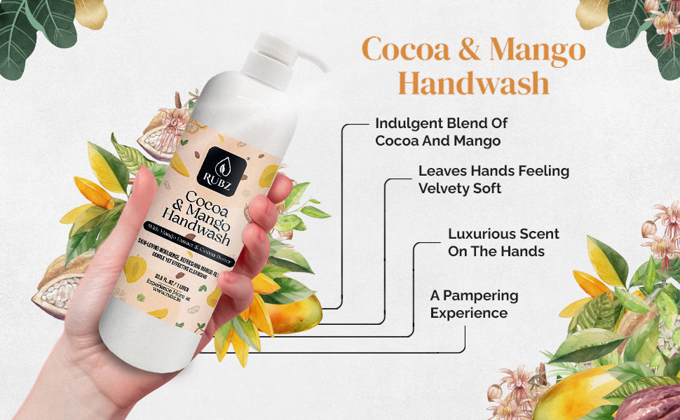 - Gentle Cleansing: Rubz Cocoa Mango Hand Wash offers effective yet gentle cleansing, leaving your skin clean and refreshed without causing dryness or irritation.