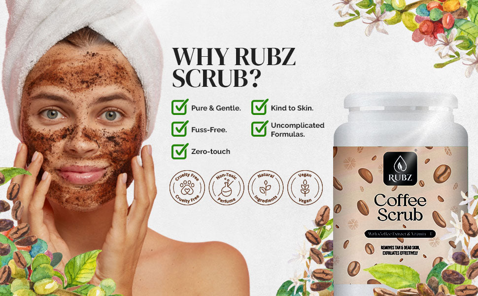 Rubz Coffee Scrub gently exfoliates and deeply cleanses your skin, effectively removing dead skin cells, tan, and impurities. Rich in antioxidants from natural coffee grounds, it stimulates blood circulation, reduces cellulite, and leaves your skin visibly smoother, brighter, and naturally radiant with every use.