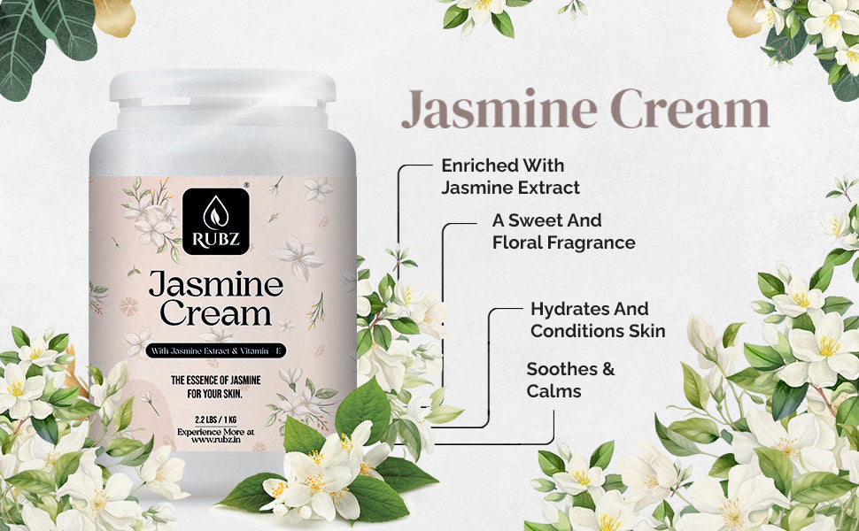- Enchanting Aroma of Jasmine Blossoms: Transform your skincare routine into a fragrant escape with the enchanting aroma of jasmine blossoms. Each application becomes a sensory delight, making Rubz Jasmine Cream not just a skincare essential but also a blissful aromatic experience.
