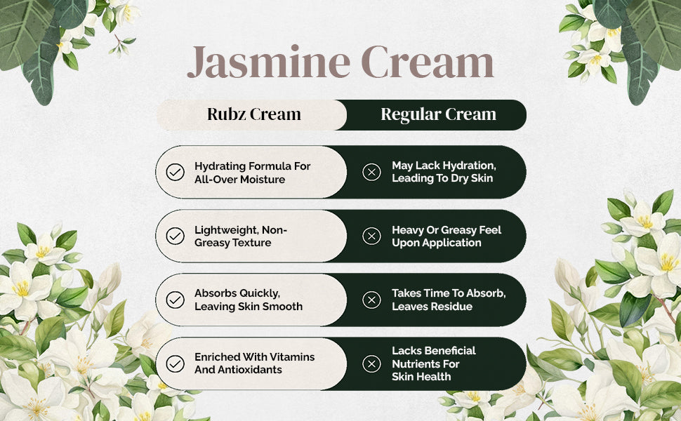 - Jasmine-Powered Radiance Boost: Experience a natural glow with Rubz Jasmine Cream, enriched with the rejuvenating properties of jasmine extract. Revel in the radiant complexion as this cream nourishes your skin, promoting a healthy and luminous glow.
