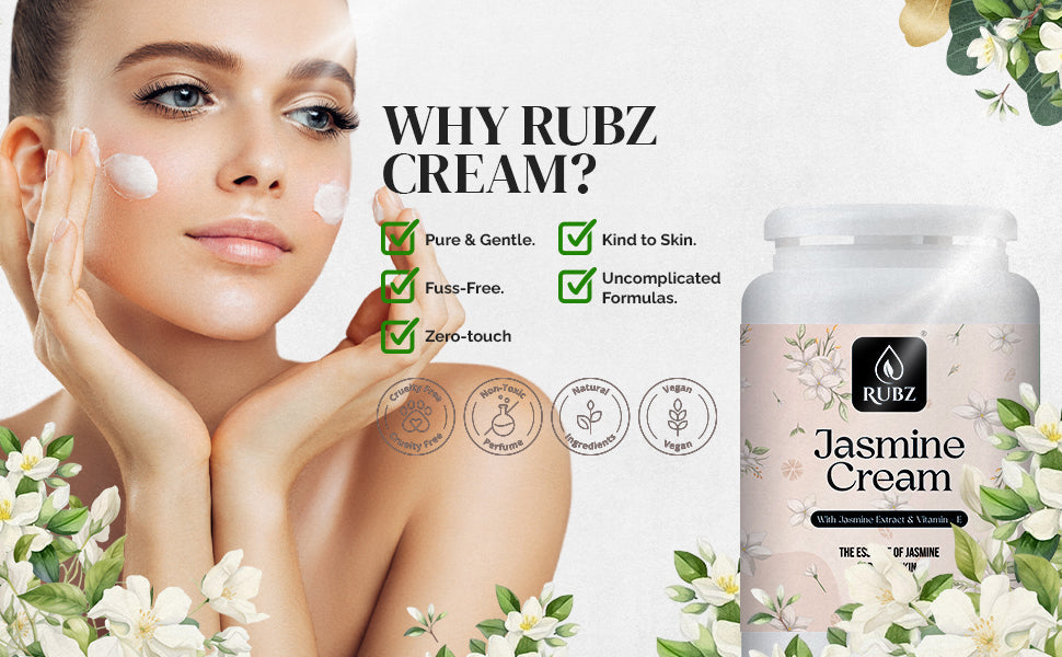 - Soothing Sensation for Sensitive Skin: Delicate yet effective, Rubz Jasmine Cream offers a soothing touch tailored for sensitive skin. Dermatologist-tested and crafted with care, this cream provides a gentle solution for those seeking a calming and nurturing skincare experience.