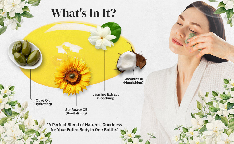 - Enchanting Jasmine Aroma: Immerse yourself in the enchanting and soothing scent of Jasmine with our Body Massage Oil. The delicate floral fragrance promotes relaxation and creates a serene ambiance during your massage.