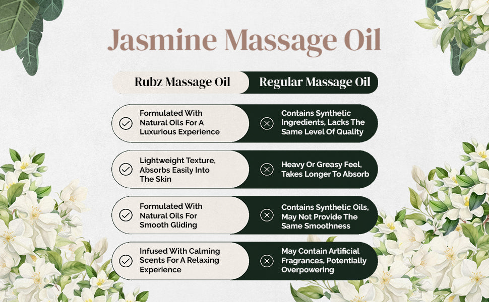 - Skin Elixir: Enriched with natural botanical extracts, Rubz Jasmine Body Massage Oil nourishes and hydrates your skin, leaving it soft, supple, and beautifully rejuvenated. Enjoy a dual benefit of relaxation and skin pampering.