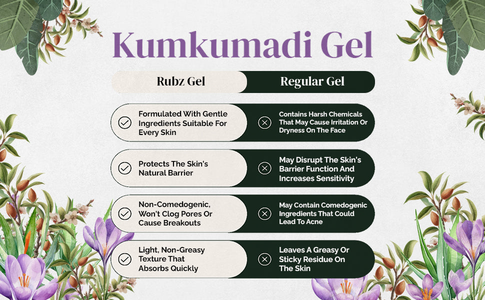 While traditional Kumkumadi oils are beneficial, they can be heavy and greasy for some skin types. Rubz Kumkumadi Gel offers the same Ayurvedic benefits in a lightweight, non-greasy gel form. This ensures quicker absorption, making it ideal for those who prefer a lighter texture without compromising on efficacy.