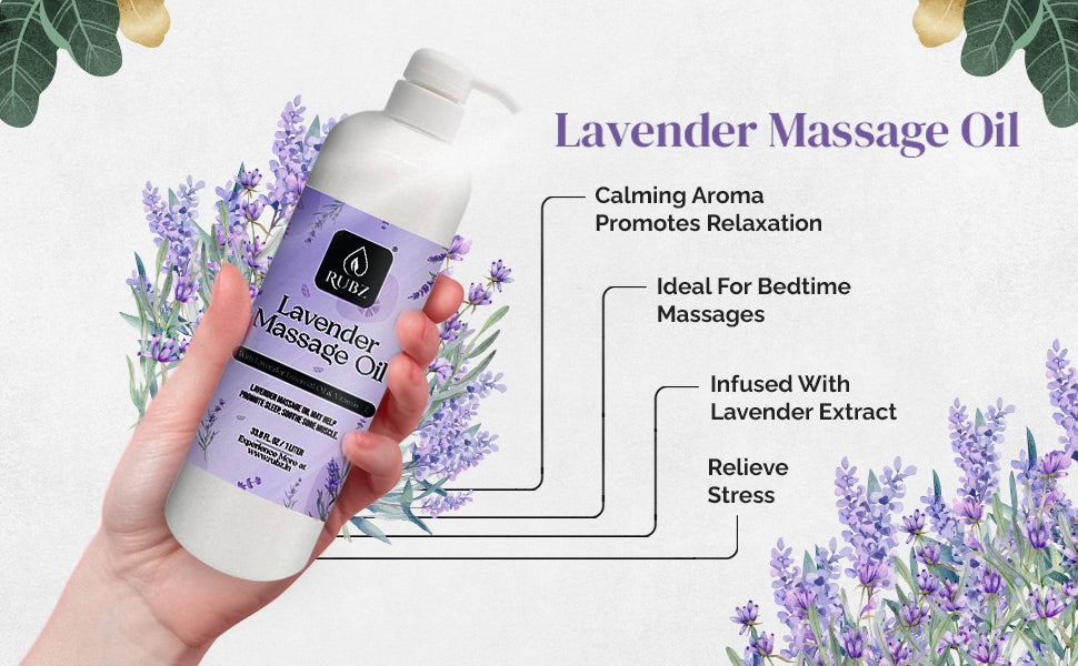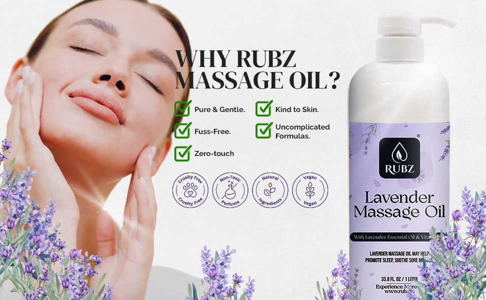 Warm a small amount of Rubz Lavender Massage Oil in your hands and massage gently over the body in circular motions. Focus on areas like the neck, shoulders, and feet to relieve stress. Use before bedtime for the best relaxation experience.
