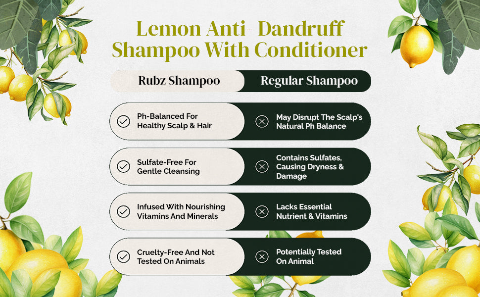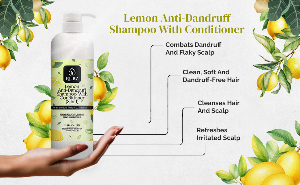 - Zesty Dandruff Defence: Rubz Lemon Anti-Dandruff Shampoo with Conditioner (2 in 1) harnesses the zingy power of natural lemon to effectively combat dandruff and refresh your scalp.