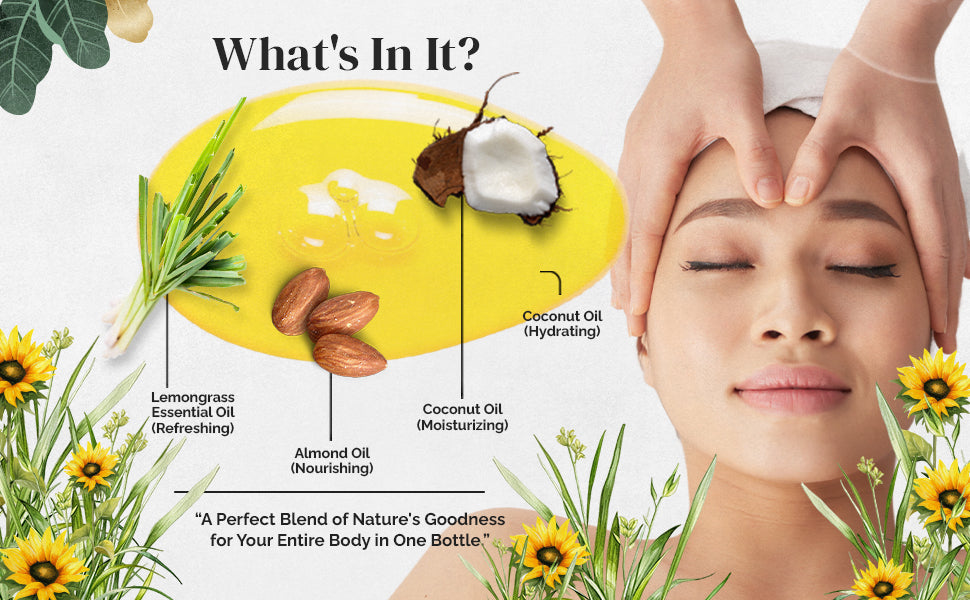 - Invigorating Lemongrass Aroma: Immerse yourself in the invigorating and uplifting scent of Lemongrass with our Body Massage Oil. Its zesty and citrusy fragrance awakens your senses, promoting a feeling of rejuvenation and energy.