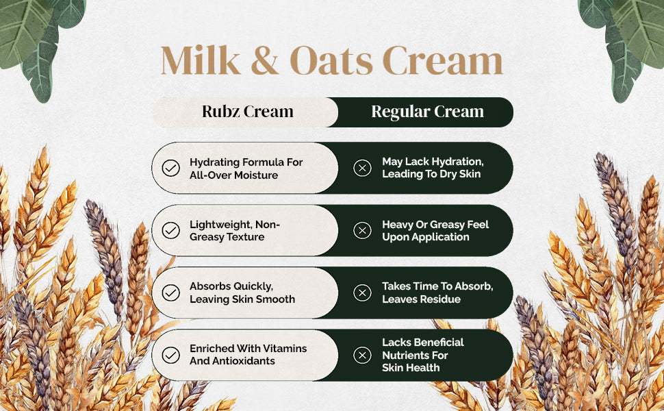 Rubz combines the exfoliating power of milk with the calming properties of oats, offering more than just hydration. Unlike standard body lotions, it gently removes dull skin while restoring moisture, making it a two-in-one exfoliating and nourishing cream—perfect for Indian skin exposed to dust, heat, and pollution.