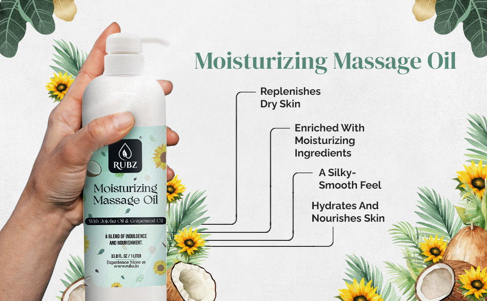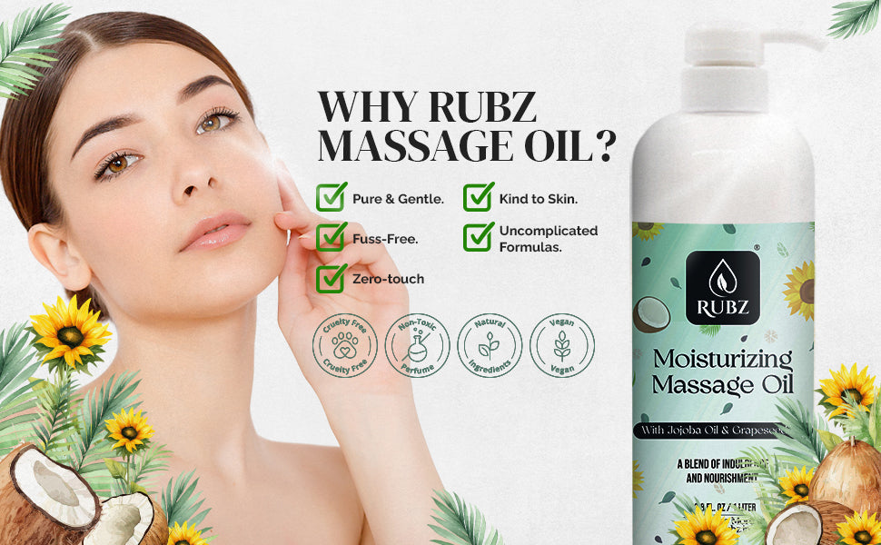 - Soothing Massage Experience for Relaxation: Elevate your massage routine with Rubz Moisturizing Massage Oil. The blend of jojoba and grapeseed oils provides a soothing experience, helping to relax your muscles and rejuvenate your skin. Enjoy a moment of tranquillity and self-care with every application.