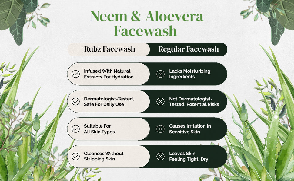 - Trusted and Effective: Backed by centuries of traditional wisdom, Rubz Neem and Aloe Vera Face Wash is designed to meet modern skincare standards, delivering effective results for healthier, clearer skin.