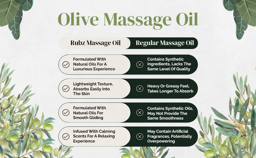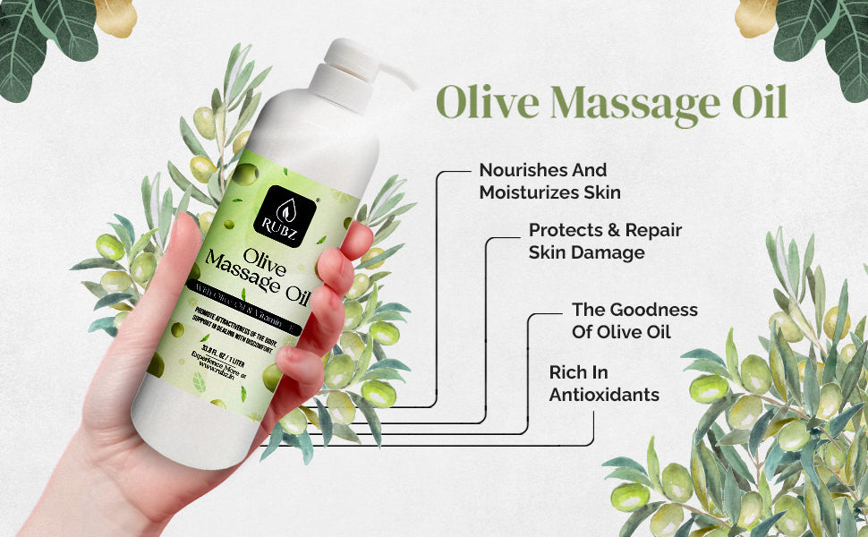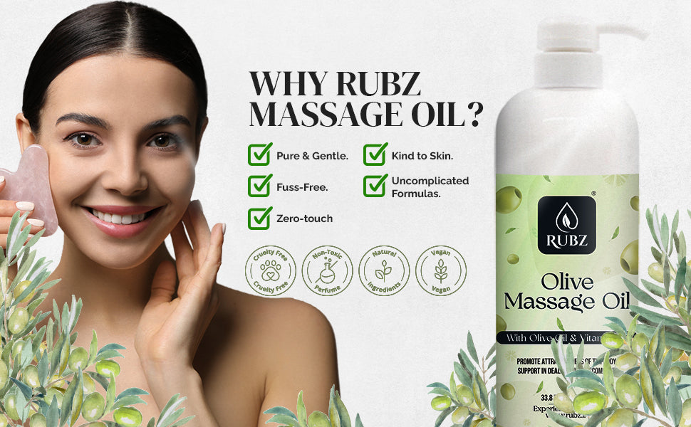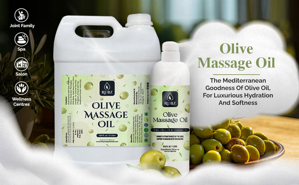 - Pure and Natural Elegance: Rubz Olive Massage Oil is crafted from the finest olives, ensuring purity and natural goodness. Experience the elegance of a massage oil that's free from synthetic additives and chemicals.