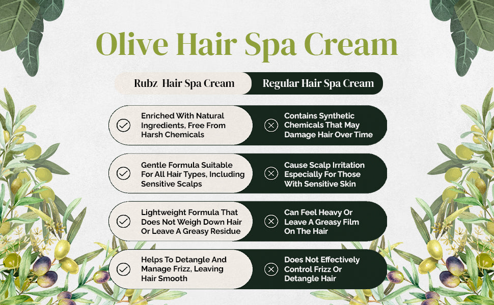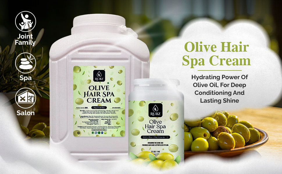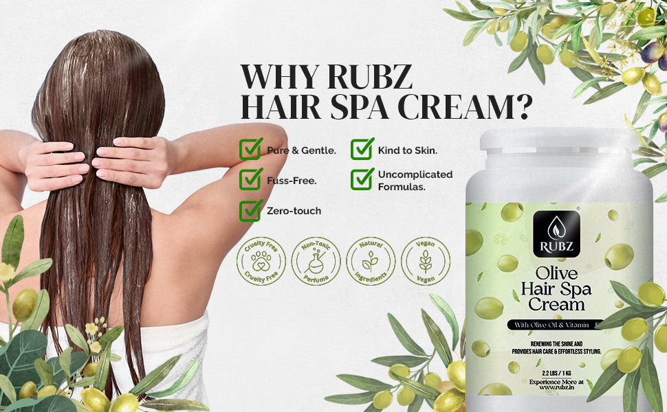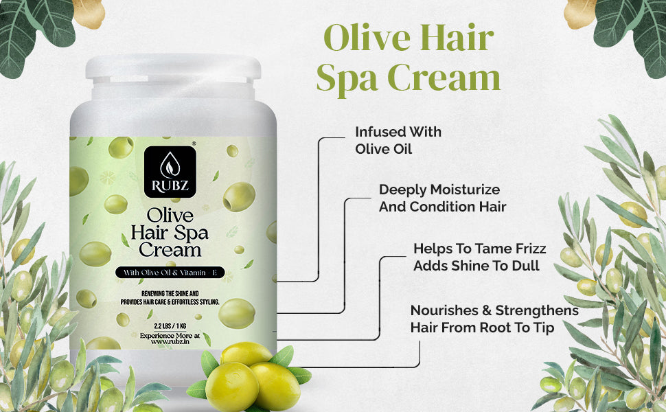- Enhance Natural Shine: Rediscover your hair's natural luster with Rubz Olive Hair Spa Cream. It enhances shine, leaving your locks looking gorgeously glossy and full of life.