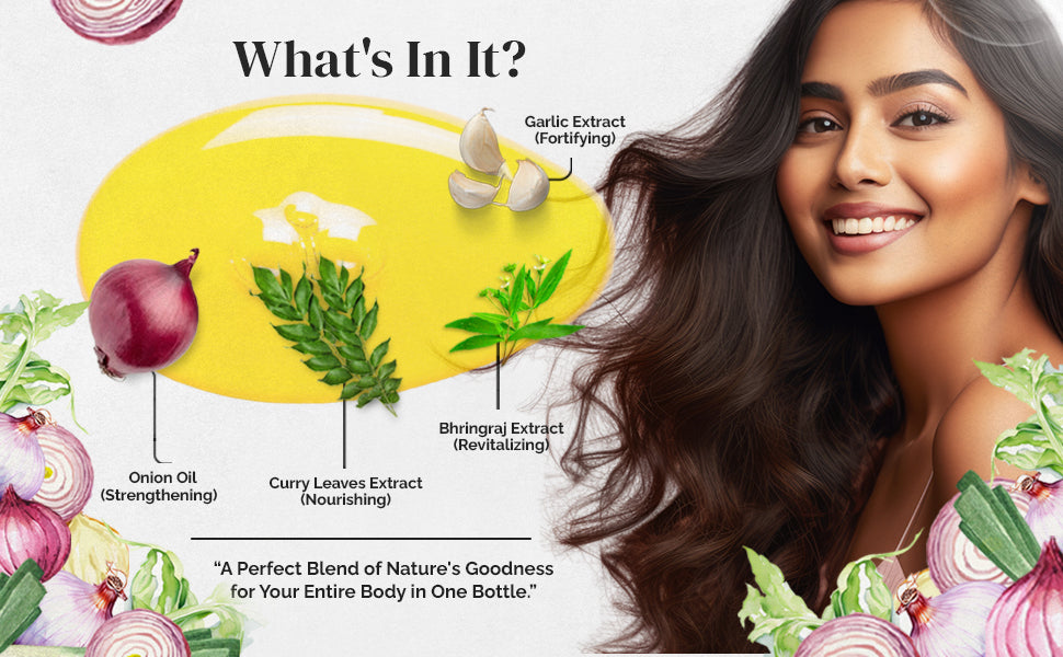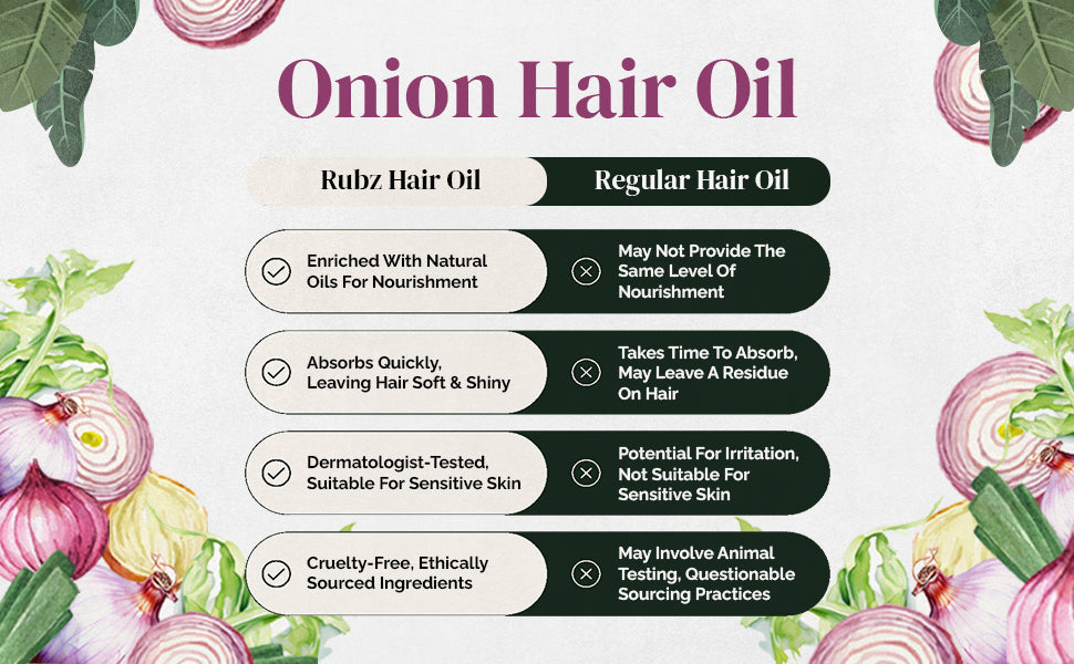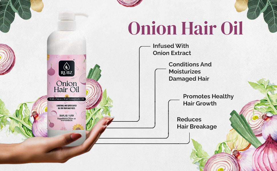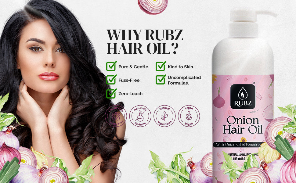 - Natural Hair Growth Stimulant: Rubz Onion Hair Oil harnesses the power of Onion Oil, Fenugreek Oil, and Bhringraj Extract to stimulate hair follicles, promoting natural and robust hair growth.