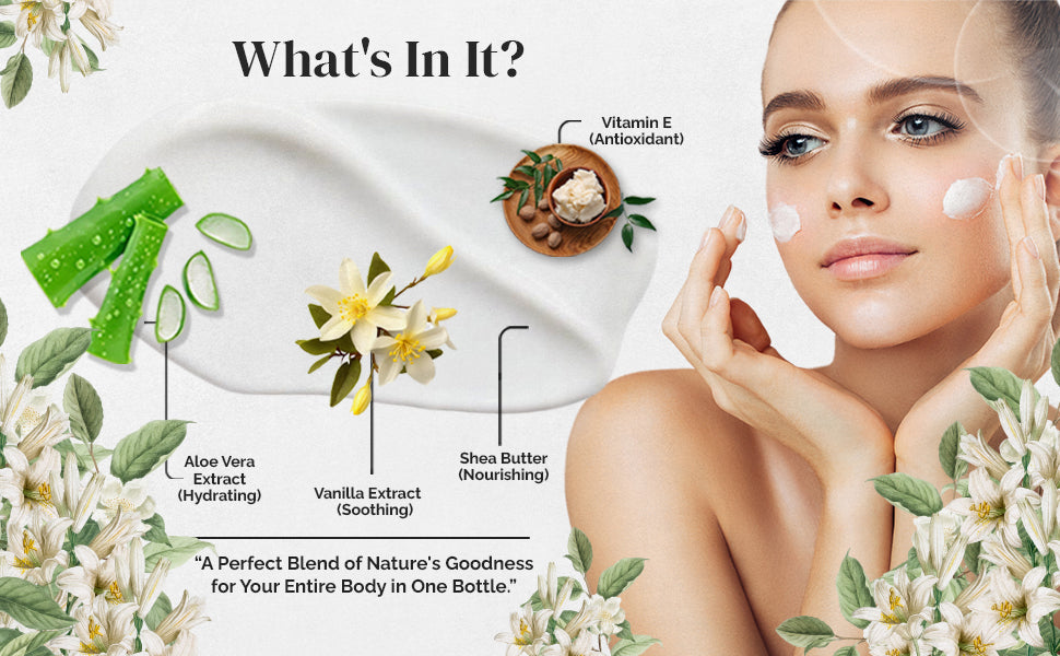 - Silky Hydration: Indulge in the luxury of velvety soft skin. Our Vanilla Body Lotion's nourishing formula deeply moisturizes, leaving your skin irresistibly smooth and beautifully hydrated.