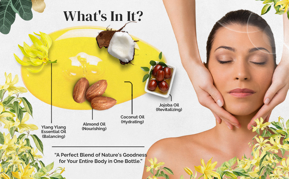 - Sensual Ylang Ylang Aroma: Immerse yourself in the sensual and exotic scent of Ylang Ylang with our Body Massage Oil. Its intoxicating and alluring fragrance creates a romantic and passionate atmosphere during your massage.