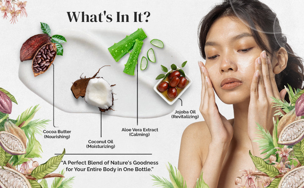 - Gentle Nourishment: Suitable for all skin types, our Cocoa Butter Body Lotion is gentle yet effective. Its non-greasy formula absorbs quickly, ensuring long-lasting moisture without any uncomfortable residue.