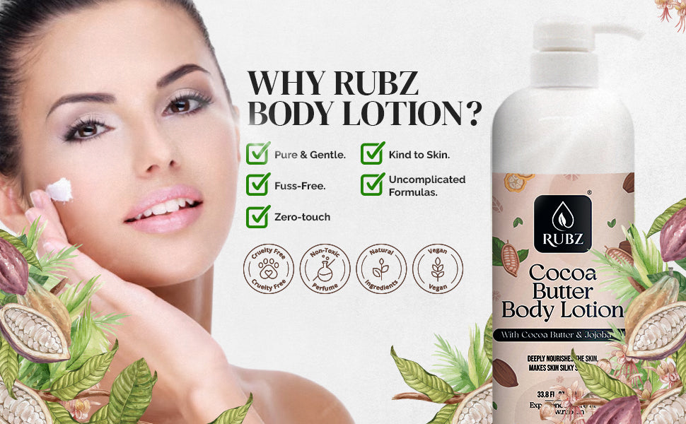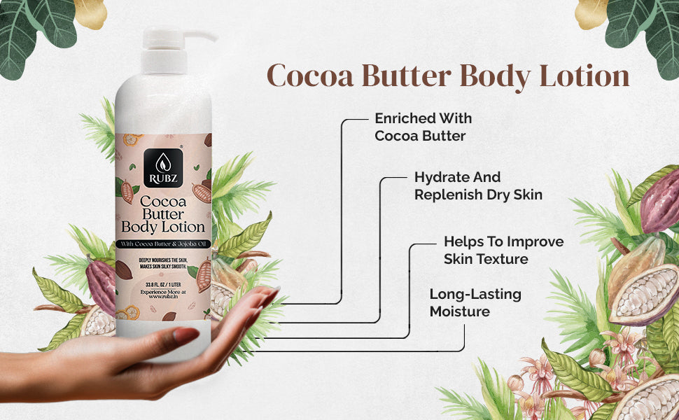 - Velvety Softness: Say goodbye to dry and rough skin. Rubz Cocoa Butter Body Lotion leaves your skin incredibly soft and supple, transforming its texture and enhancing its natural radiance.
