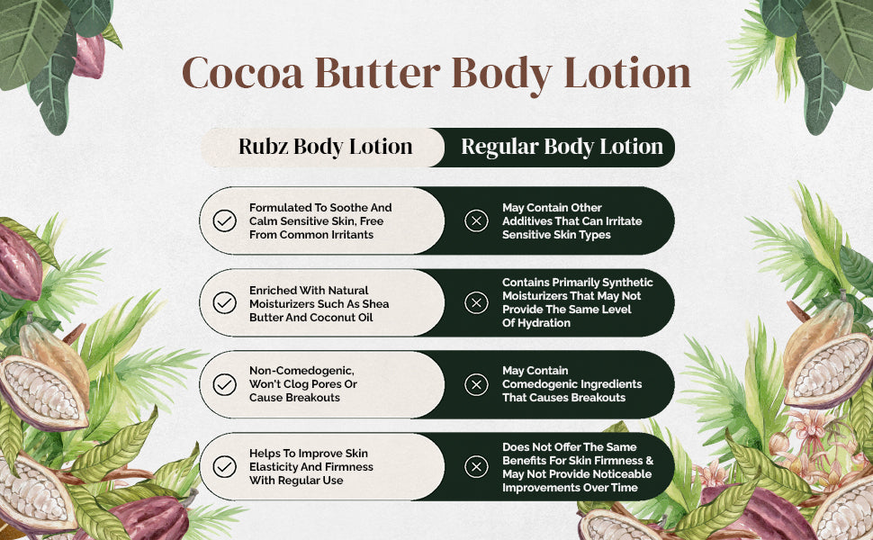 - Everyday Luxury: Elevate your daily self-care routine with the opulence of cocoa butter. Our lotion offers a delightful sensory experience, enveloping your skin in a comforting cocoon of nourishment and soothing fragrance.