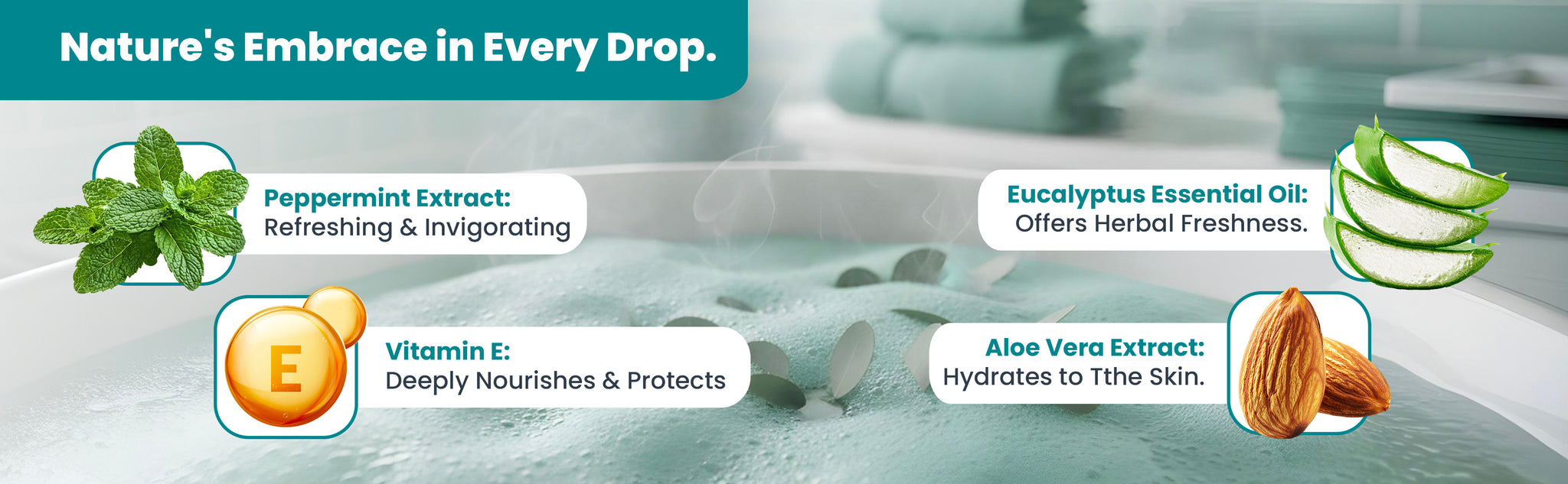 DM Water, Sodium Laureth Sulfate, Cocamidopropyl Betaine, Sodium Chloride, Glycerin, Aloe Vera Extract, Peppermint Extract, Eucalyptus Essential Oil, Almond Oil, Coconut Oil, Phenoxyethanol, Citric Acid, Vitamin-E, Fragrance