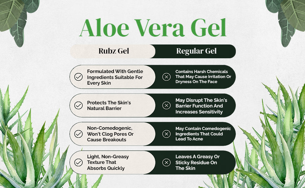 - Versatile Skincare: Rubz Aloe Vera Gel is a multi-purpose beauty essential, suitable for all skin types. Use it as a moisturizer, makeup primer, or to soothe various skin issues.
