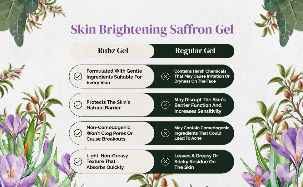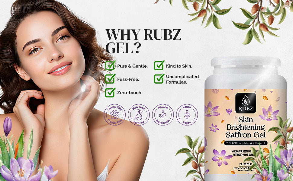 - Radiant Complexion: Rubz Saffron Gel is enriched with saffron, known for its skin-brightening properties, helping to achieve a more luminous and even complexion.